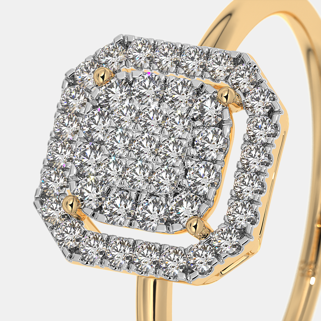 This exquisite ring is a perfect harmony of elegance and sophistication. Crafted with a sleek gold band, it features a captivating square-shaped centerpiece encrusted with brilliant pavé-set stones. The double halo design enhances the sparkle, making the ring radiate brilliance from every angle. Its refined craftsmanship highlights the beauty of symmetry and detail, creating a luxurious yet timeless piece.