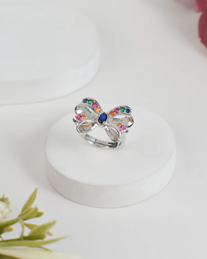 Whimsical yet luxurious, this bow-shaped ring is a true celebration of femininity and charm. Expertly crafted with a polished silver finish, the ring is designed in the graceful form of a ribbon bow, symbolizing elegance, joy, and timeless beauty. At its center lies a striking oval gemstone, radiating depth and brilliance, while the flowing bow loops are adorned with vibrant multicolored stones that sparkle with playful vibrance.