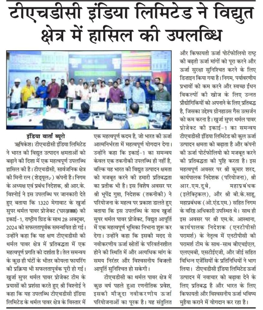 THDC India Limited formely Tehri hydro Development Corporation Limited The main “new project” in Khurja is the Khurja Super Thermal Power Project (STPP), a 1320 MW coal-fired power plant that recently achieved commercial operation for both of its 660 MW units. This project uses advanced supercritical technology and will help address power deficits in the Northern Region, especially for Uttar Pradesh. It is being implemented by THDC India Limited and was officially inaugurated in September 2025. Khurja super thermal power project or Khurja STPP is an under construction 1320 megawatt, coal-fired supercritical power plant at Khurja in Bulandshahr, Uttar Pradesh, India. The project is the first thermal power project by THDC Ltd, projected to cost ₹12676 crores (US$1.8 billion).